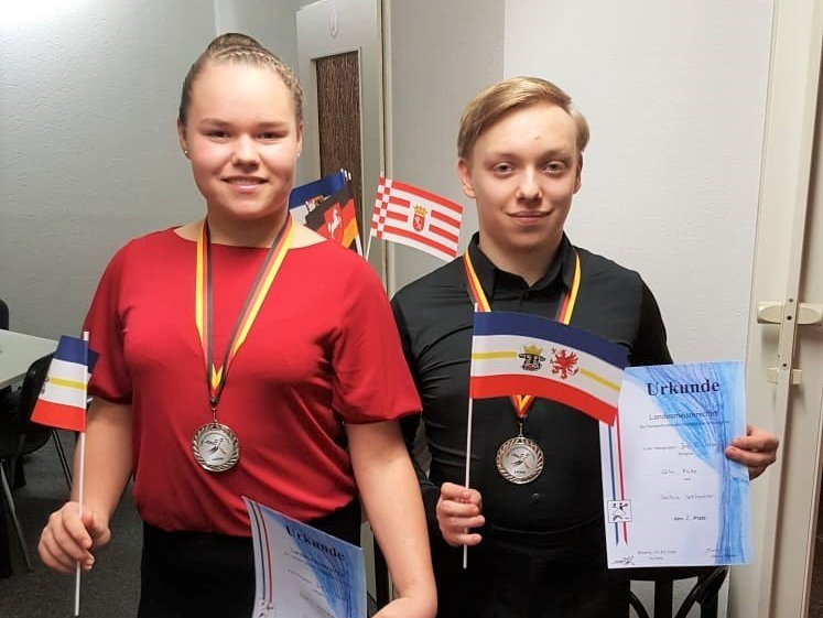 Der TC Gold und Silber Bremen war an diesem Tag Ausrichter der Norddeutschen Meisterschaften aller Altersklassen in der Kombination. Erwin & Lotte gingen in der jüngsten Altersklasse der Junioren II B-Klasse an den Start und mussten alle 10 Turniertänze präsentieren. Mit ihren phantastischen Leistungen konnten sie die Wertungsrichter überzeugen und belegten den 2. Platz in ihrem Wettbewerb. Damit sind sie Norddeutsche Vizemeister und Landesmeister Mecklenburg-Vorpommern.